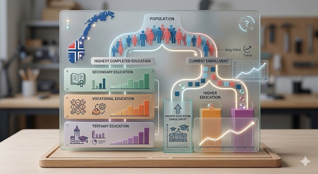 Det norske folk er blant de best utdannede i verden. En svært høy andel av befolkningen har fullført høyere utdanning, noe som gjenspeiler skiftet fra en industribasert økonomi til en kunnskapsøkonomi. Dette høye kompetansenivået er nødvendig for å opprettholde konkurransekraften i et globalt marked. Samtidig ser vi en utfordring i at for få velger yrkesfaglige retninger, noe som fører til mangel på fagarbeidere innenfor viktige håndverksfag. Balansen mellom akademisk og praktisk kompetanse er et sentralt politisk tema for å sikre fremtidig verdiskaping.